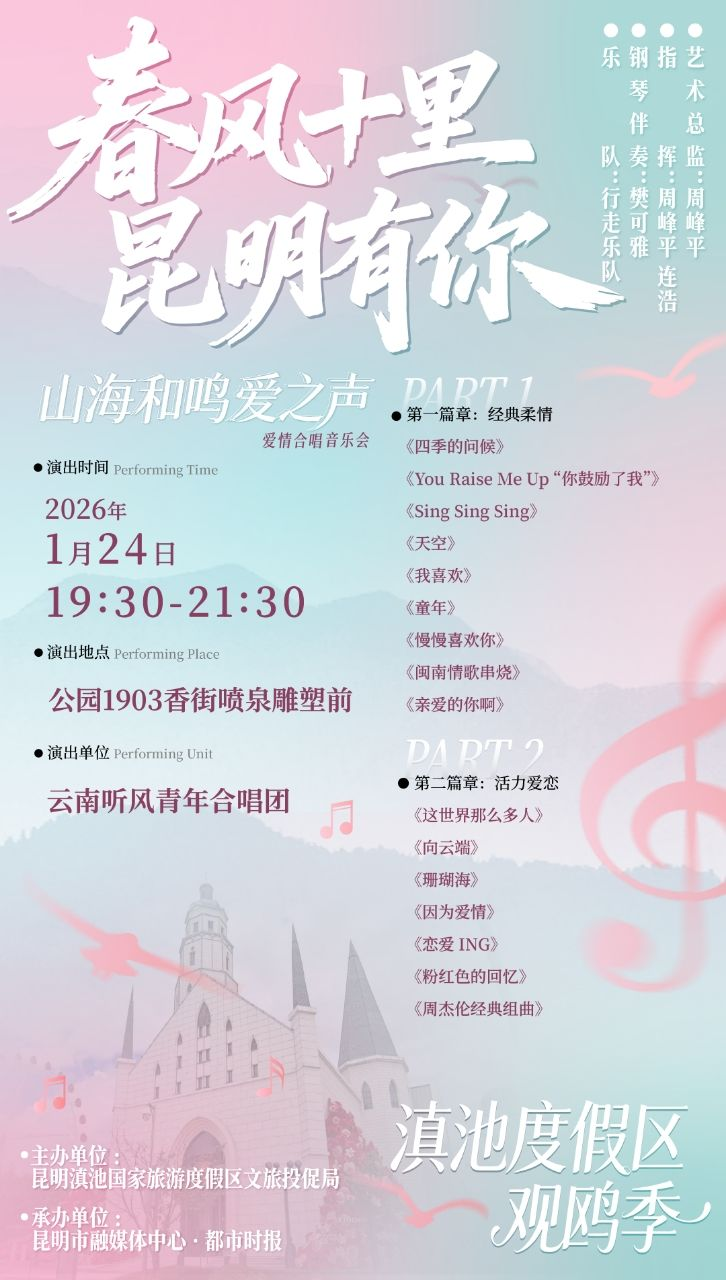 “春风十里·昆明有你”滇池旅游度假区观鸥季爱情合唱音乐会,将于1月24日(周六)19:30再次在公园1903香街喷泉雕塑前温情开唱。本次音乐会汇聚了云南合唱领域的精英力量,16首跨越时代与风格的经典曲目,将用歌声传递爱与希望,为冬日的春城增添一抹浪漫色彩。