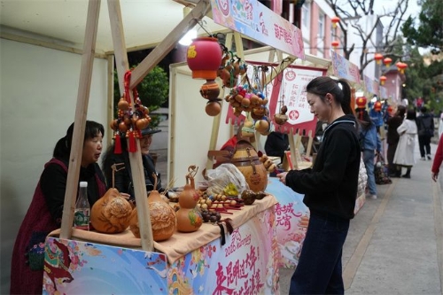 轻饮食、手工艺品、设计品、艺术品、装饰品等文创产品集中亮相。手工香、扎染、汉族刺绣、布艺拼贴、葫芦雕绘等作品琳琅满目,兼具艺术价值与生活气息;传拓、点翠、叮叮糖、豌豆粉、鲜花饼等特色体验,则让游客在品尝与制作中触摸非遗温度……红灯高挂、龙狮舞动的新春场景,与非遗技艺交相辉映,勾勒出一幅“非遗闹元宵”的生动图景。