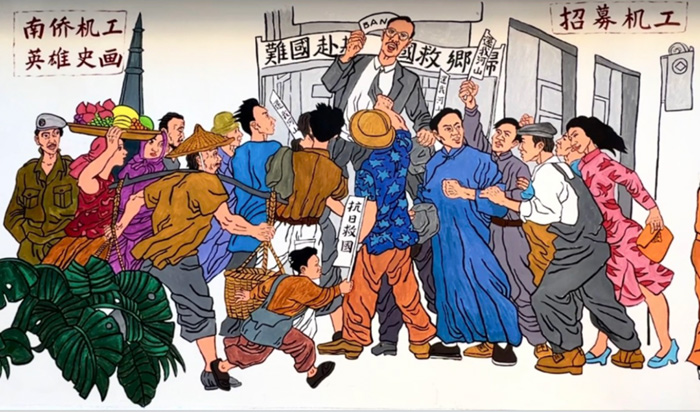 壁画中,既有华侨青年告别亲人、整装出发的不舍与坚定,也有机工们坚守运输前线、众志成城的热血与担当,搭配纪念馆风格的墙面装饰、南洋机工元素的汽车图案,全方位立体呈现了南侨机工的英雄群像。