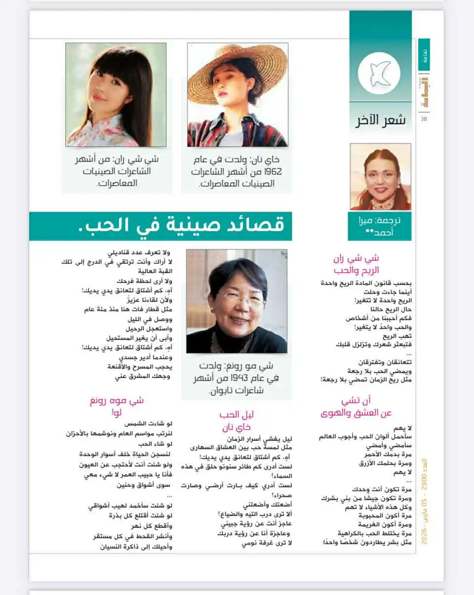 近日,沙特阿拉伯著名杂志《AIyamama》推出徐志摩、席慕蓉、三毛、王山、海男、安琪、施施然、杨碧薇等8位中国现当代诗人的爱情诗作,云南诗人海男、杨碧薇作品入选,作品由米拉·艾哈迈德(Mira Ahmed)翻译。