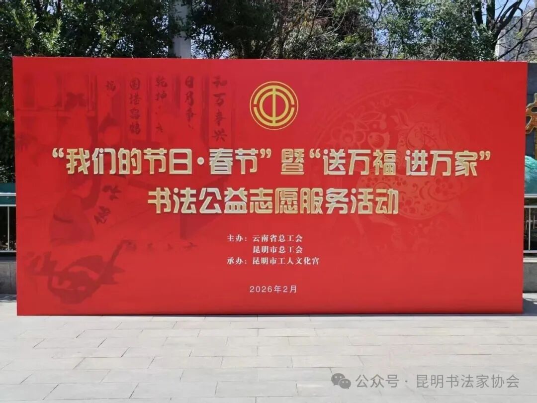 在云南省总工会、昆明市总工会主办,昆明市工人文化宫承办的2026年“我们的节日·春节”暨“送万福 进万家”书法公益志愿服务活动中,昆明书法家协会积极响应,选派了20余位书法家作为文艺志愿者现场挥毫,为职工群众和市民送上新春祝福。