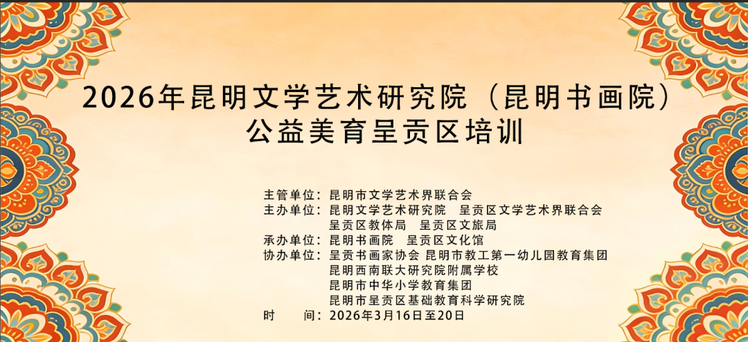 为扎实推进文艺惠民工作,提升市民书法绘画美育素养与文艺创作水平,2026年昆明文学艺术研究院(昆明书画院)公益书画美育培训呈贡站活动将于3月16日至20日在呈贡区文体活动中心文化档案馆举办,诚邀广大书画从业者、爱好者及书法家、美术家协会会员报名参与。